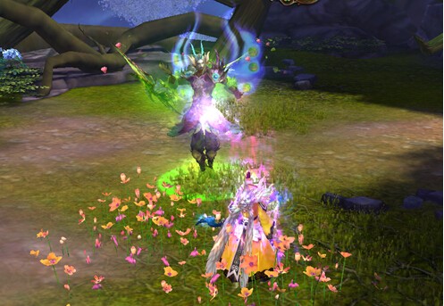 通过藤蔓桥后,会看到4个树妖和一个紫罗兰,紫罗兰无法被攻击,处于此区域中,会受到法力遗失的效果,每2秒减少800点法力值,任意一个树妖受到攻击后,会召唤出4只蚁兵,同时,其他树妖也会召唤出4只蚁兵并寻找目标进行攻击,当四个树妖都被击败后,紫罗兰会死亡。通过第二个藤蔓桥后,会看到精英怪物“崔寅”。