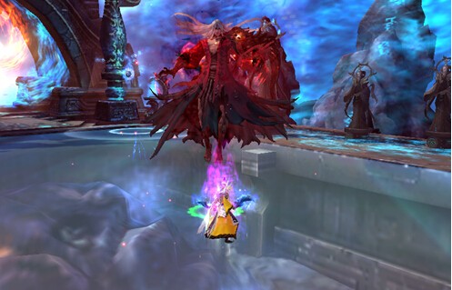 当BOSS血量低于90%后,进入第二阶段,BOSS每隔一段时间会召唤一排血魔守卫,向正前方移动,被血魔守卫冲撞到的玩家,每次受到15000点伤害。