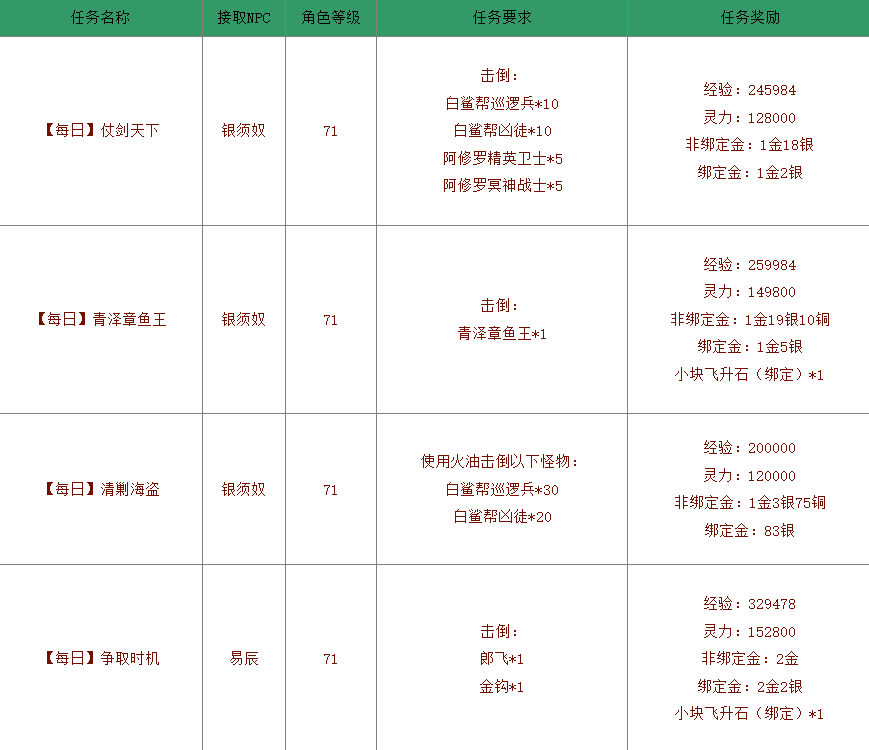 海盗巢穴是一个以获取大量经验、灵力为主的副本,副本内的BOSS不掉落任何装备。此副本有4个日常任务,而接取这4个任务需完成一系列的前置任务,第一个前置任务是人物达到71级后在NPC“易辰”接取”任务”威胁”。