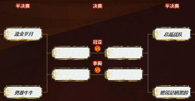 2023年醉逍遥【玉玺争霸】八进四淘汰赛已于10月12日晚20:45结束。但有群雄拔剑起,风啸旗掣鼓未停。八支小队在各自抽取的分组中经过了3V3、6V6、2V2的鏖战,最终【流金岁月】、【勇敢牛牛】、【总裁战队】、【她说是晒黑的】四支小队协作无间,力克强敌,用最完美的战术配合和最过硬的个人实力战胜了对手,成功晋级本次玉玺争霸赛四强,恭喜他们!