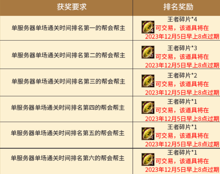 3、若某个服务器的某些帮会单场通关时间出现相同的情况,则会在次日加开一场团战副本,并以该次副本的通关时间来决定排名。(若第四至第六名出现并列则不会加开)