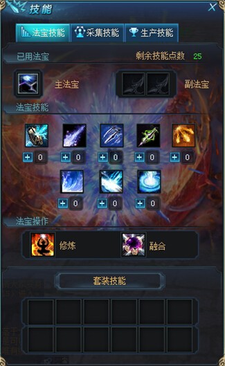 法宝修炼后将会诞生出各种新的“技能”及“技能点(法宝天赋)”,当法宝修炼等级达到11级之后,每升2级将获得1点法宝天赋,按“S键”进入技能界面,可进行分配。“剩余点数”表示可分配的天赋值,左键点击“法宝天赋”栏中的技能图标,就可以提升技能等级,技能等级提高的效果一般是:增强伤害,增强暴击率,减少法力消耗,缩短技能冷却时间等。