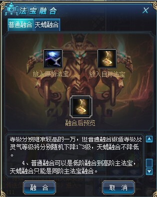 4.被融合的法宝取原法宝的修炼等级与锻造等级,取目标法宝的品质与附加属性;