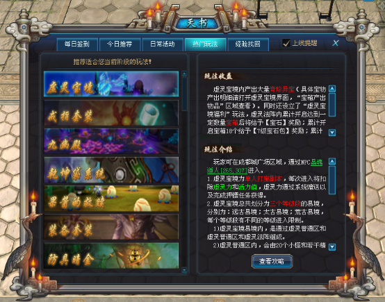 “热门玩法”将根据玩家等级向玩家推荐适合当前阶段的玩法,包含虚灵宝境、套装、九幽殿、乾坤袋、果酱、占卜等玩法的收益、介绍和攻略。