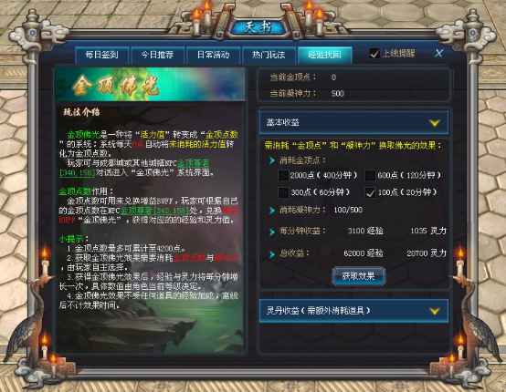 “经验找回”面板中,玩家可将自身当前的金顶点数和凝神力转换为经验和灵力的收益,使用道具【金顶灵丹】可获得更高的经验收益。无须再长途跋涉,前往NPC金顶尊者处兑换了。
